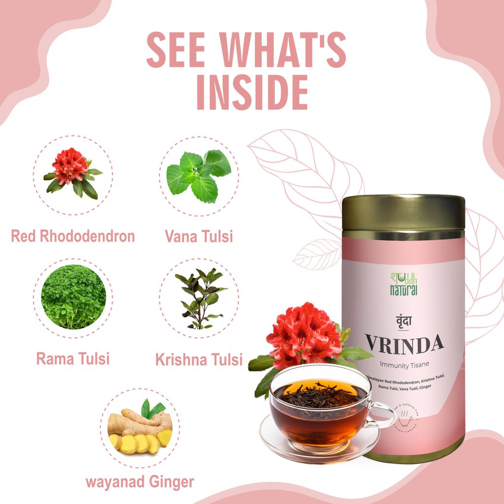 - An antioxidant-rich herbal floral tea made with Rama Tulsi,Krishna Tulsi, Vana Tulsi, Sun dried ginger pods and hand-picked petals from Himalayan Rhododendron blooms.