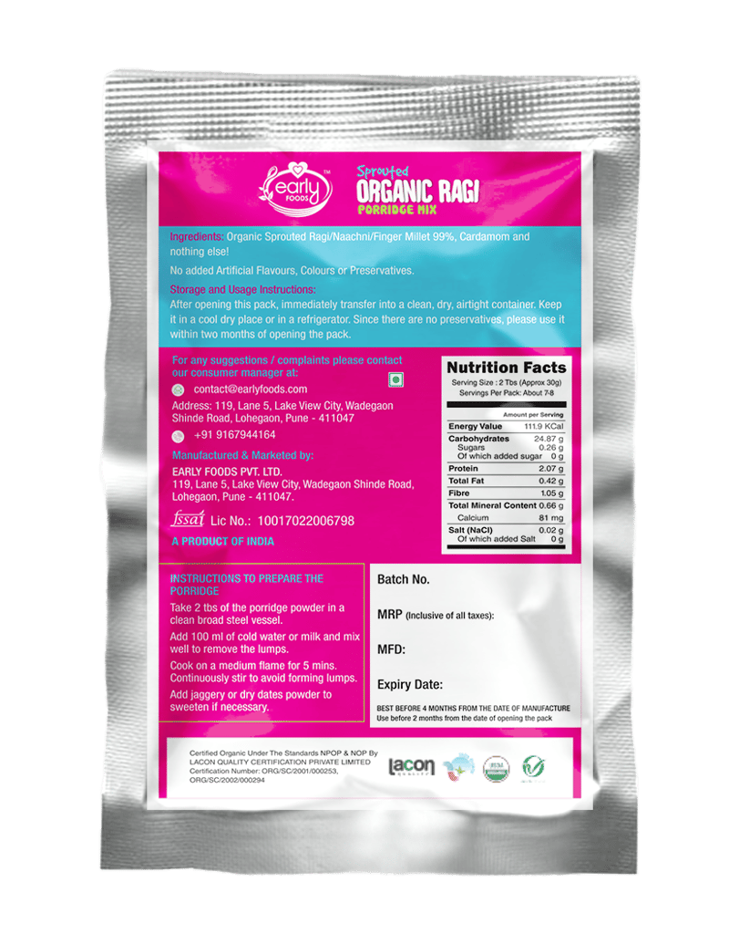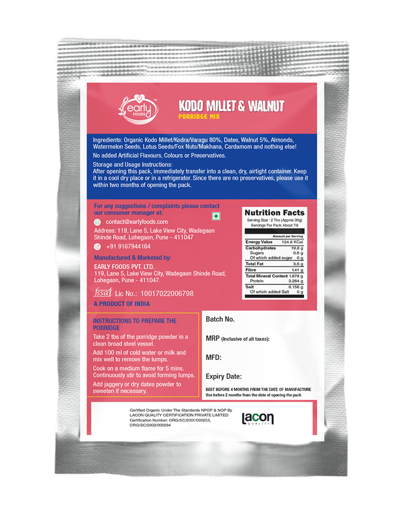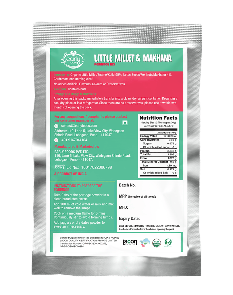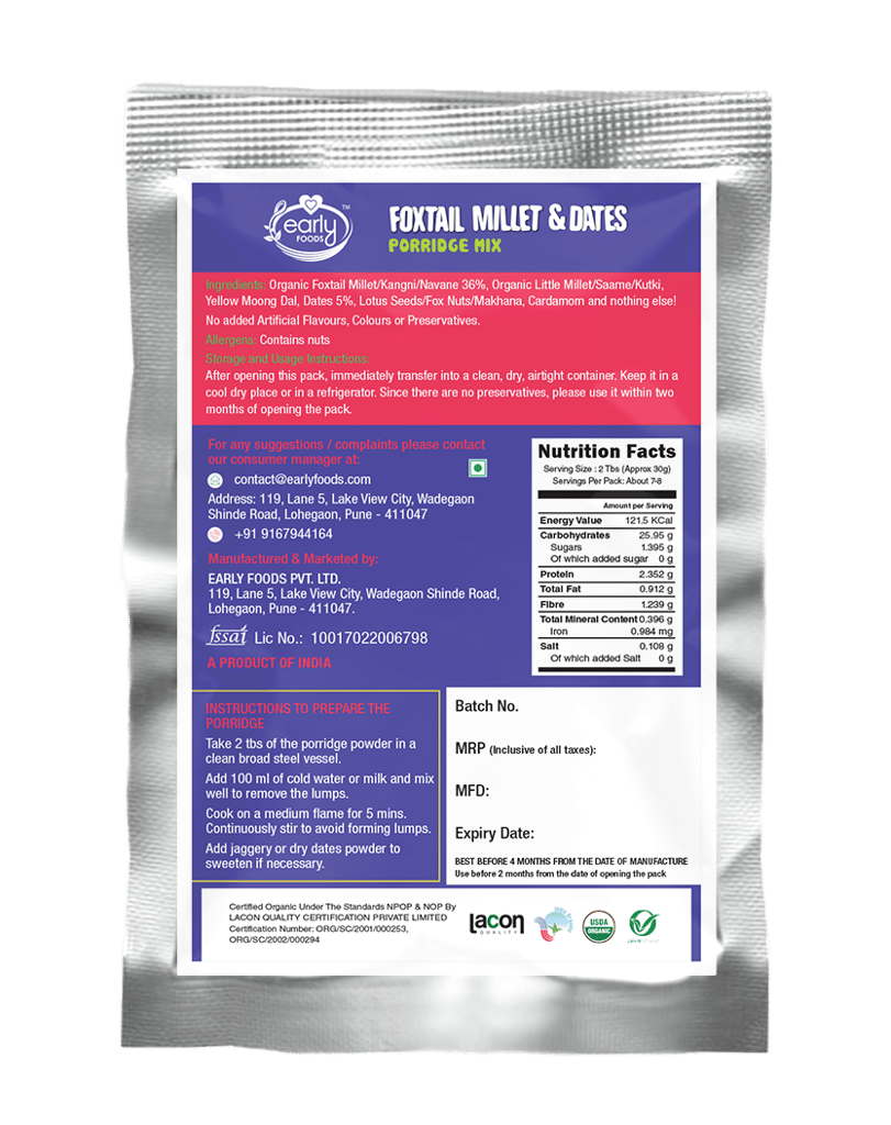 - Ingredients include Organic certified millets (Ragi, Little Millet, Bajra, Foxtail Millet, Kodo Millet), Almonds, Watermelon Seeds, Dates, Pumpkin Seeds, Makhana and Cardamom