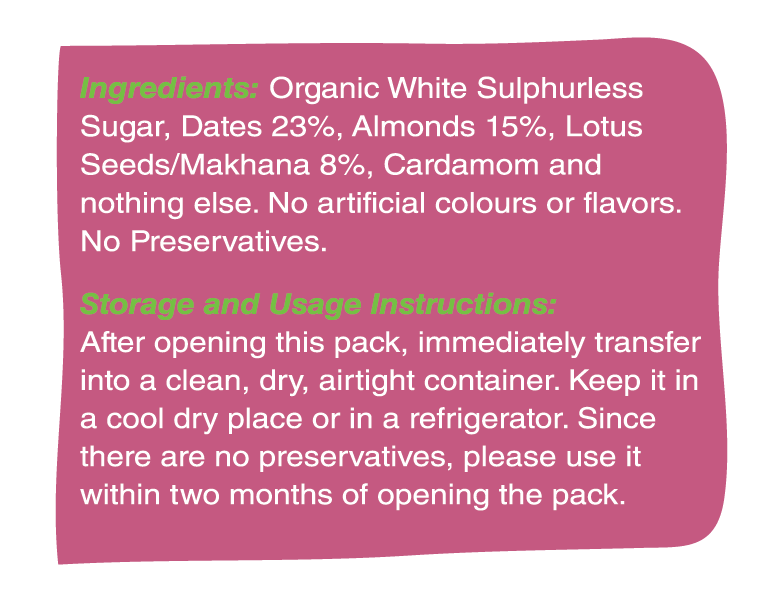 - Ingredients Include, Brown Sugar, Dates , Almonds, Lotus Seeds/Fox Nuts/Makhana, Cardamom