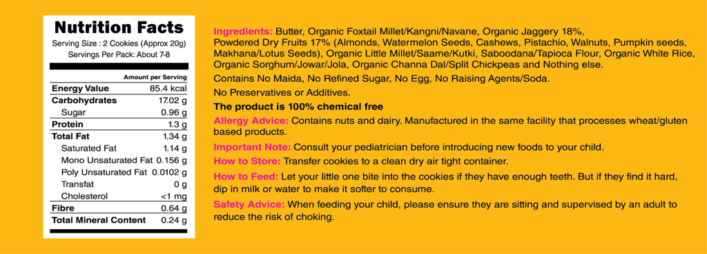 - Ingredients include, Organic Whole Grains (Ragi, Foxtail Millet, Little Millet, Jowar/Sorghum, White Rice, Channa Dal, Amaranth), Butter, Organic Jaggery, Saboodana, Dry Fruits Powder, Dates, Organic Raw Cacao Powder