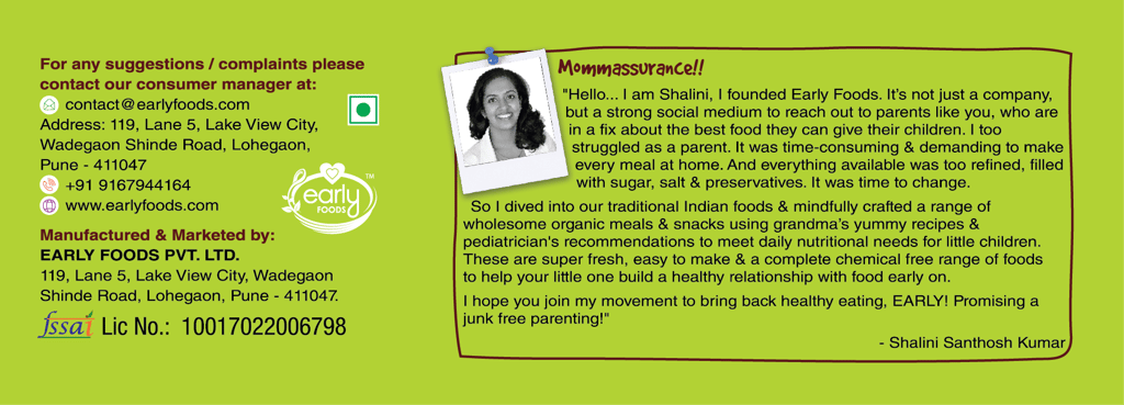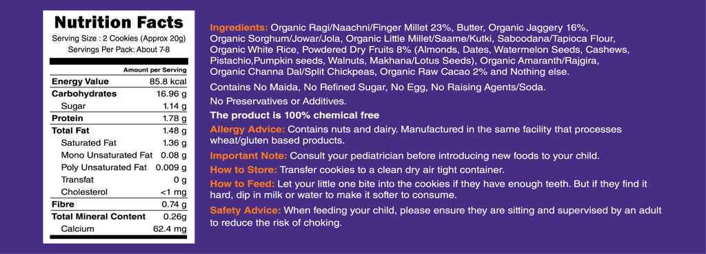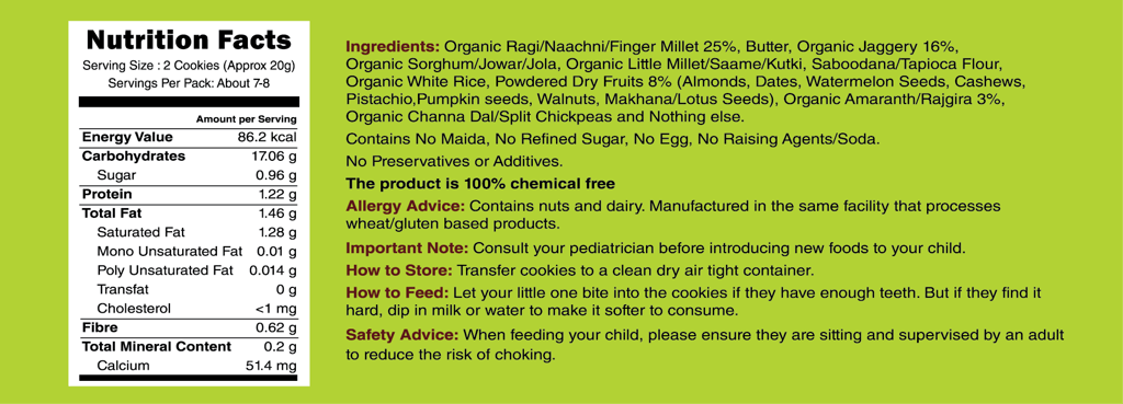 - Ingredients include, Organic Whole Grains (Ragi, Little Millet, Jowar/Sorghum, White Rice, Channa Dal, Amaranth), Butter, Organic Jaggery, Saboodana, Dry Fruits Powder, Dates, Cardamom, Organic Raw Cacao Powder