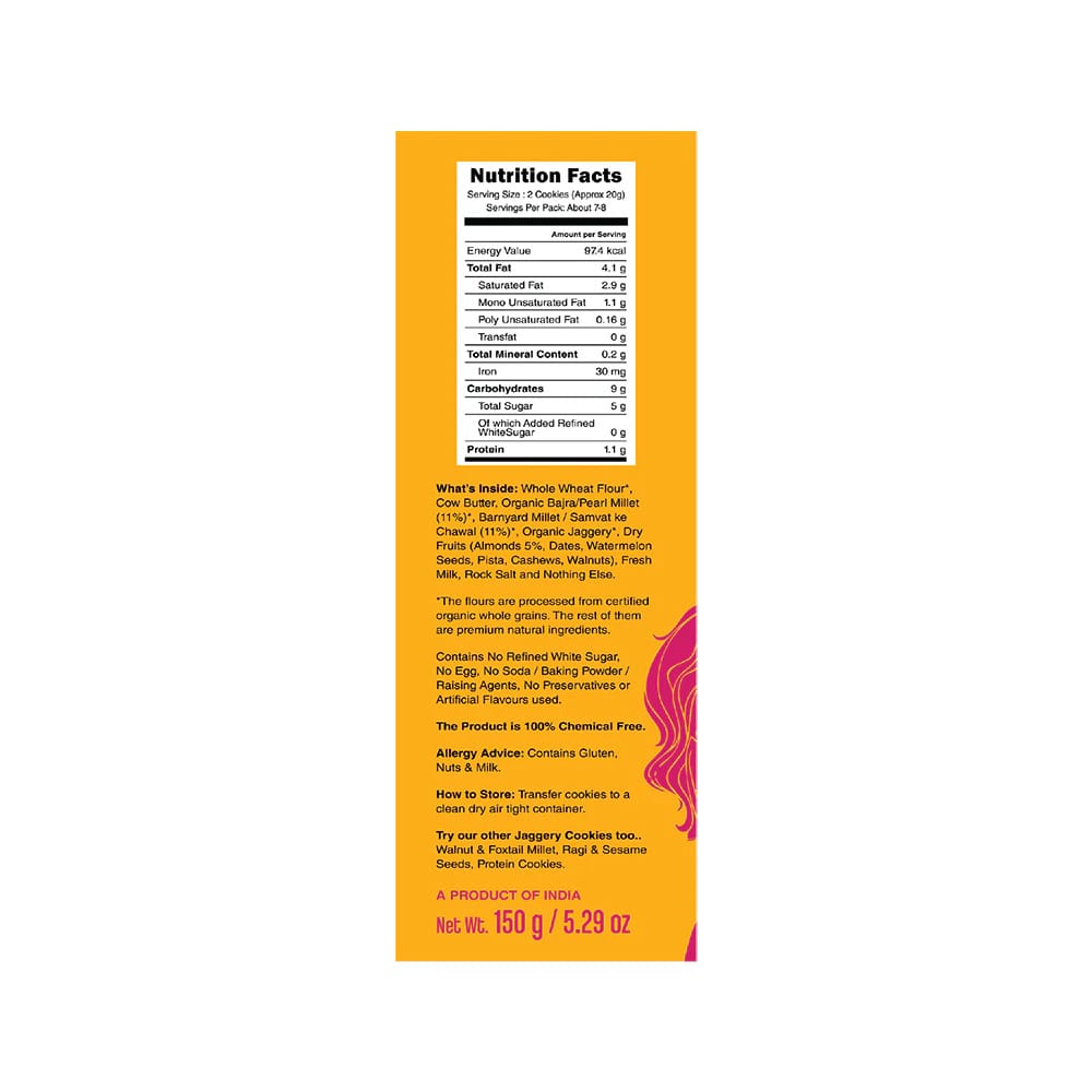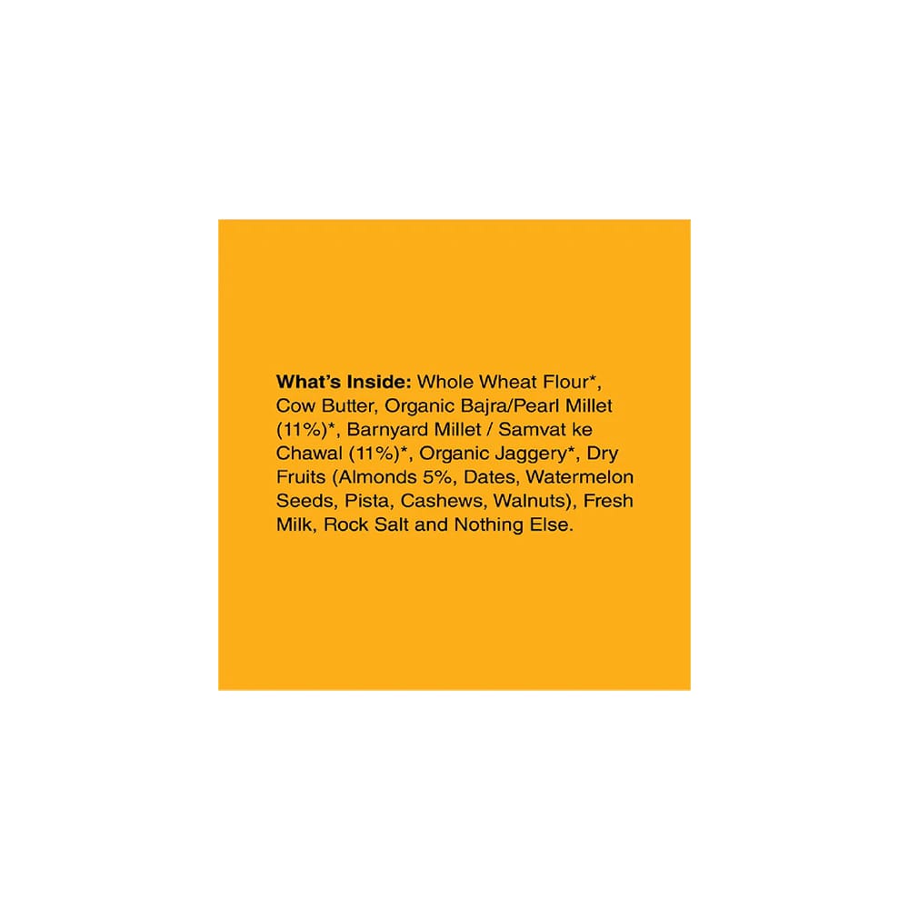 - Ingredients include, Butter 20%, Organic Jaggery 16%, Organic Barnyard Millet/Jhangora/Oodhalu 14%, Organic Pearl Millet/Bajra/Sajje 14%, Organic Sorghum/Jowar/Jola, Organic Little Millet/Saame/Kutki, Saboodana/Tapioca Flour, Organic White Rice, Powdered Dry Fruits (Watermelon Seeds, Cashews, Pistachio, Walnuts), Dates, Organic Channa Dal/Split Chickpeas, Almonds 2%