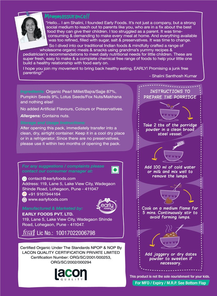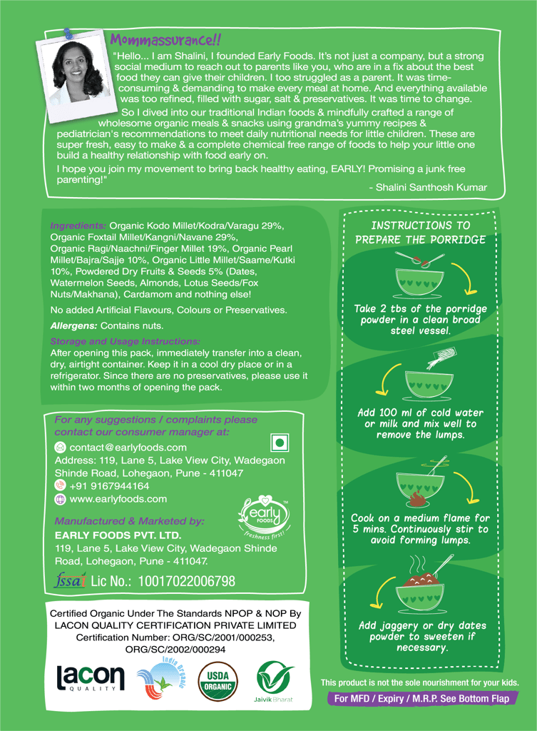 - Ingredients include Organic certified millets (Ragi, Little Millet, Bajra, Foxtail Millet, Kodo Millet), Almonds, Watermelon Seeds, Dates, Pumpkin Seeds, Makhana and Cardamom