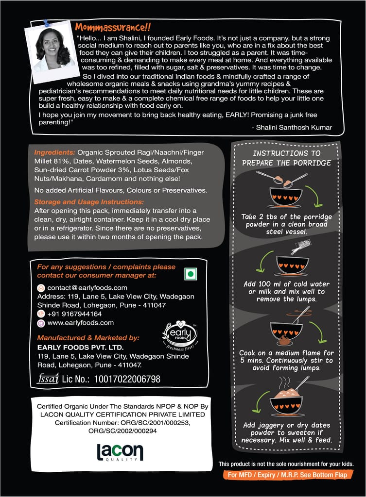 - Ingredients include, Organic Wheat, Sprouted Ragi, Rice, Spilt Moong dal, Dates, Almonds, Watermelon Seeds, Lotus Seeds/Makhana, Cardamom