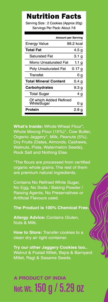 - Ingredients include,Organic Green Lentils/Dal 27%, Butter 20%, Organic Jaggery 16%, Organic Sorghum/Jowar/Jola, Organic Little Millet/Saame/Kutki, Saboodana/Tapioca Flour, Organic White Rice, Powdered Dry Fruits (Almonds, Dates, Watermelon Seeds, Cashews, Pistachio, Walnuts, Pumpkin seeds, Makhana/Lotus Seeds), Groundnuts 2%, Channa Dal/Split Chickpeas