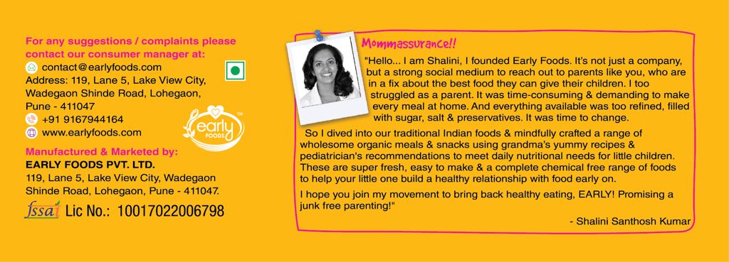 - Ingredients include, Organic Foxtail Millet, Little Millet, White Rice, Jowar/Sorghum, Channa Dal, Butter, Organic Jaggery, Saboodana/Tapioca Flour, Dry Fruit Powder, Dates