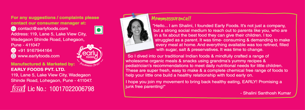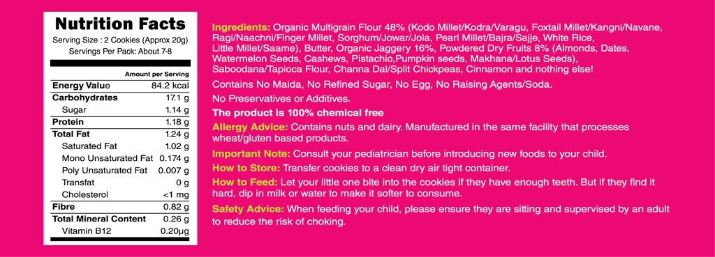 - Ingredients include, Organic Ragi, Bajra, Foxtail Millet, Little Millet, Jowar, Rice, Kodo Millet, Channa Dal, Butter, Organic Jaggery, Saboodana, Dry Fruits, Cinnamon