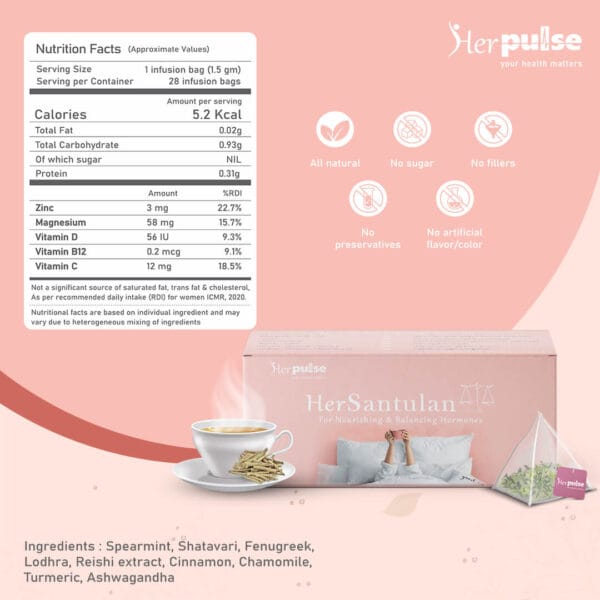 • HerSantulan is developed with safe and natural ingredients to support symptoms of hormonal imbalance, PCOS, PCOD, estrogen dominance, and thickening of the endometrium lining.