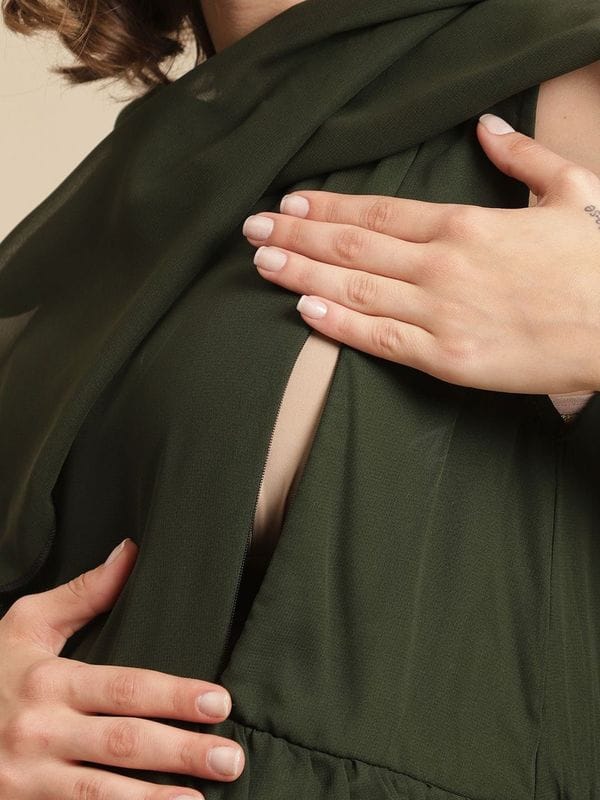 - Georgette Solid olive Print Maternity Dress, Front Buttons for nursing post pregnancy.