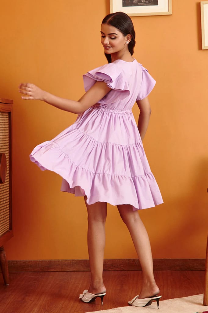 - Our stunning Audrey Dress comes in this striking Lilac colour! It features elasticated detail beneath the bust and has Pleated statement sleeves.