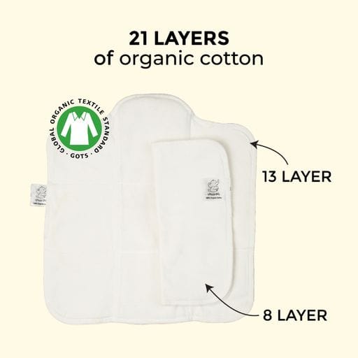 - Ideal fit for babies from 3 months to 2 years Or 5 to 14 kgs Contents: 1 Multi-sized Outer Shell , 1 Soaker Pad & 1 Booster Pad Structure: The New Age Cloth Diaper can ensure your baby has a dry, cushy bum with our wet-free prefold pad that consists of 13 layers of GOTS certified 100% organic cotton and 8 layers of Booster Pad.