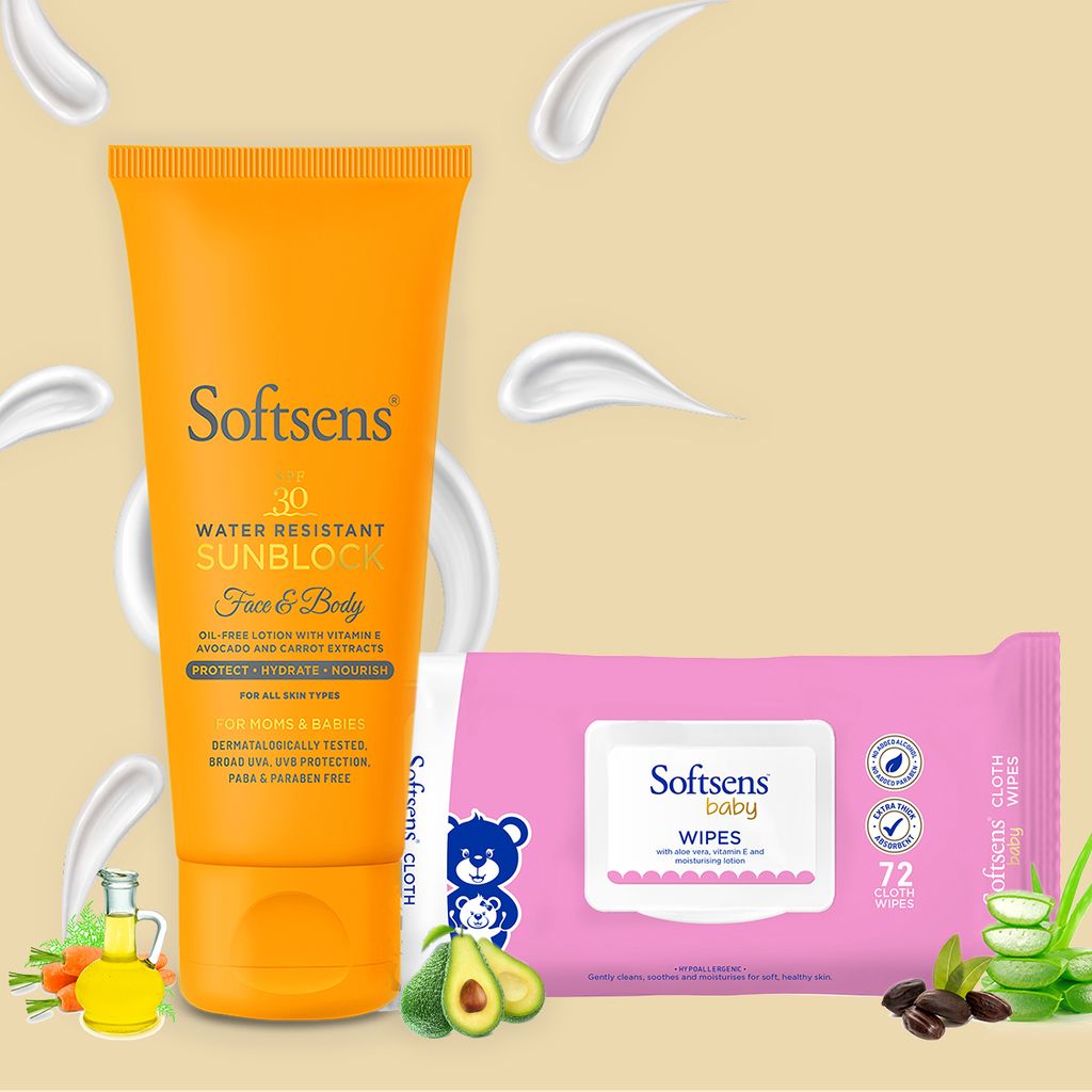 Softsens all-natural cloth baby wipes are infused with moisturizing lotion, hydrating jojoba oil and cooling aloe vera to cleanse, soothe and soften skin. Softsens SPF 30 Sunblock Lotion is enriched with zinc oxide that acts as a protective barrier between the skin and sun's rays, along with Vitamin E, avocado and carrot extracts that protect and moisturize even the most delicate skin