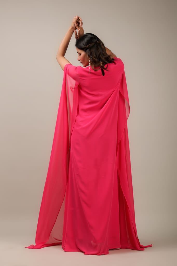 • It featured closed neck with long cape sleeves.