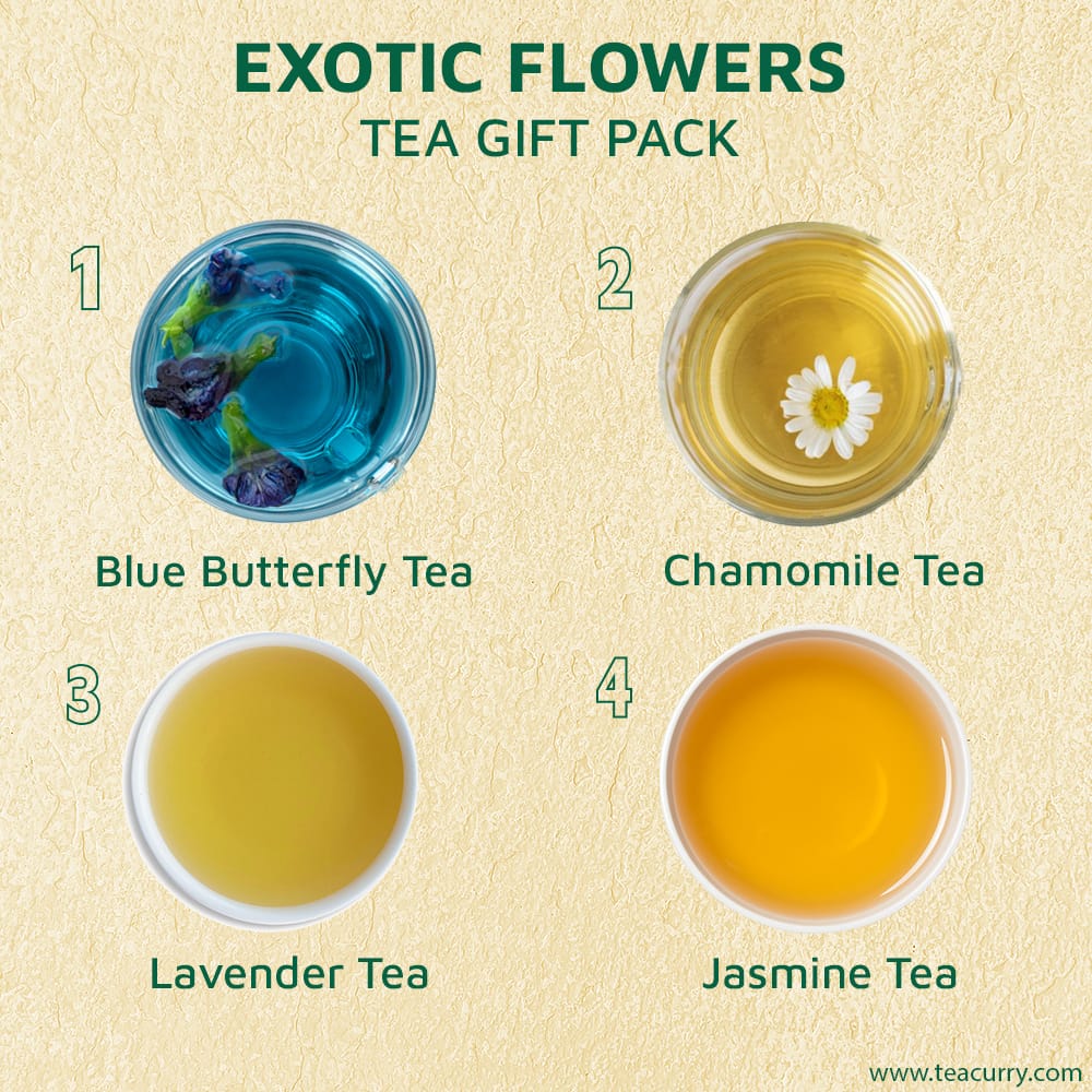 - This premium Gift pack of Exotic Flowers Gift Box consists of Blue Butterfly Tea, Chamomile Tea, Jasmine Tea and Lavender Tea.