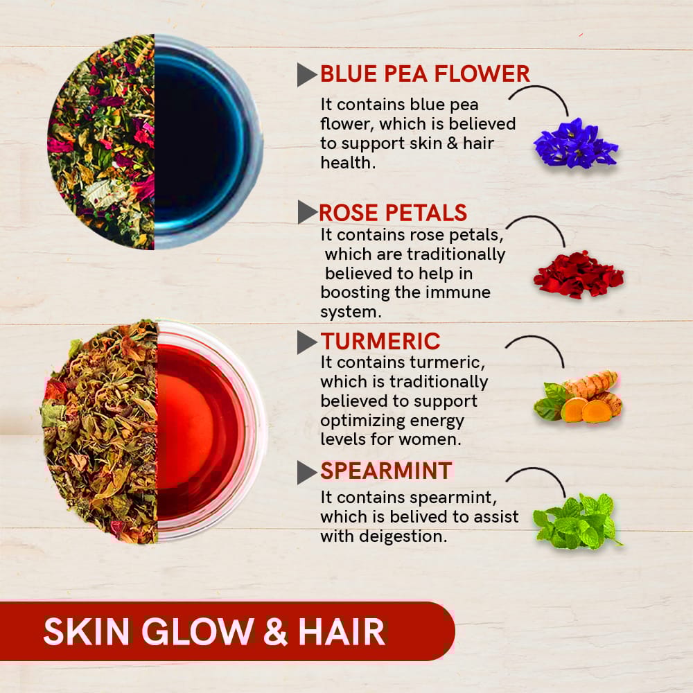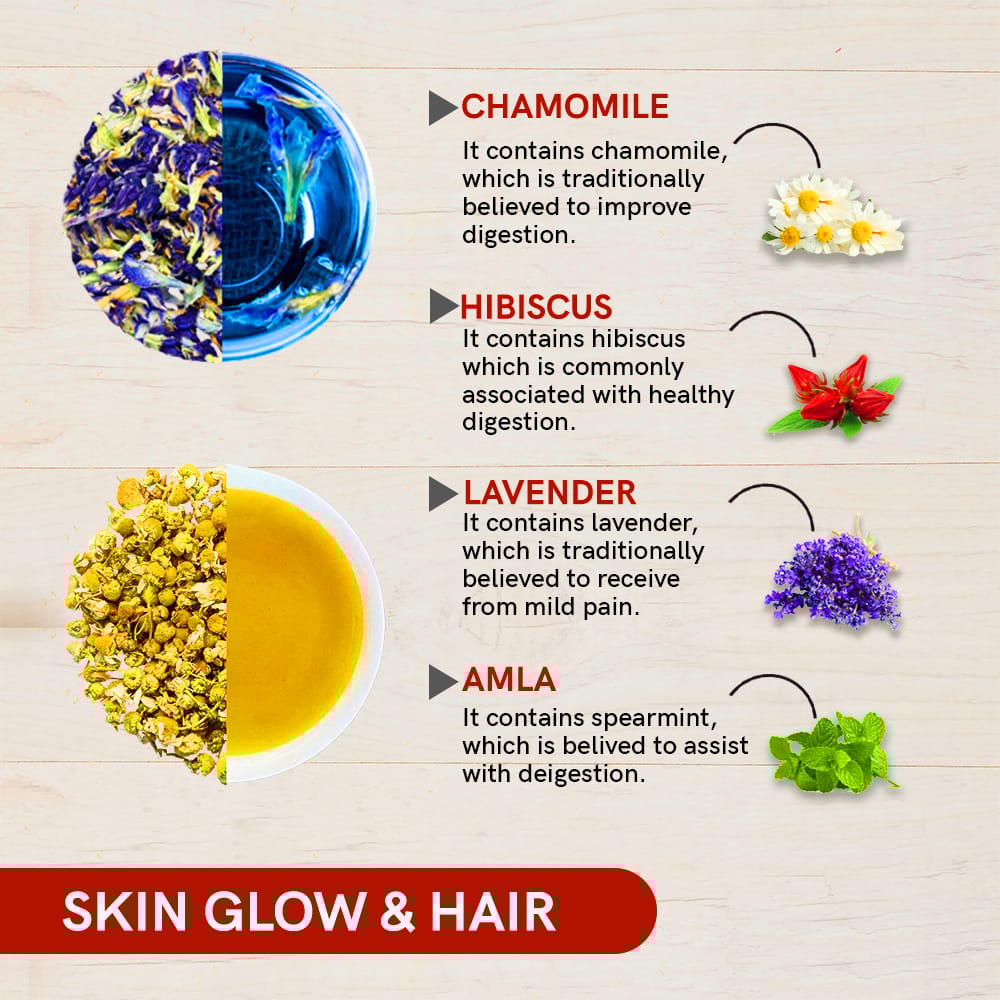 - Skin and Hair Gift Box tea bags are enclosed in a beautiful box made of luxurious quality starboard, consisting of four different varieties of tea bags- Skin Glow Tea Bags (4 pieces), Blue pea Tea Bags(4 pieces), Hair Teabags(4 pieces) and Chamomile Spiced Teabags(4 pieces).